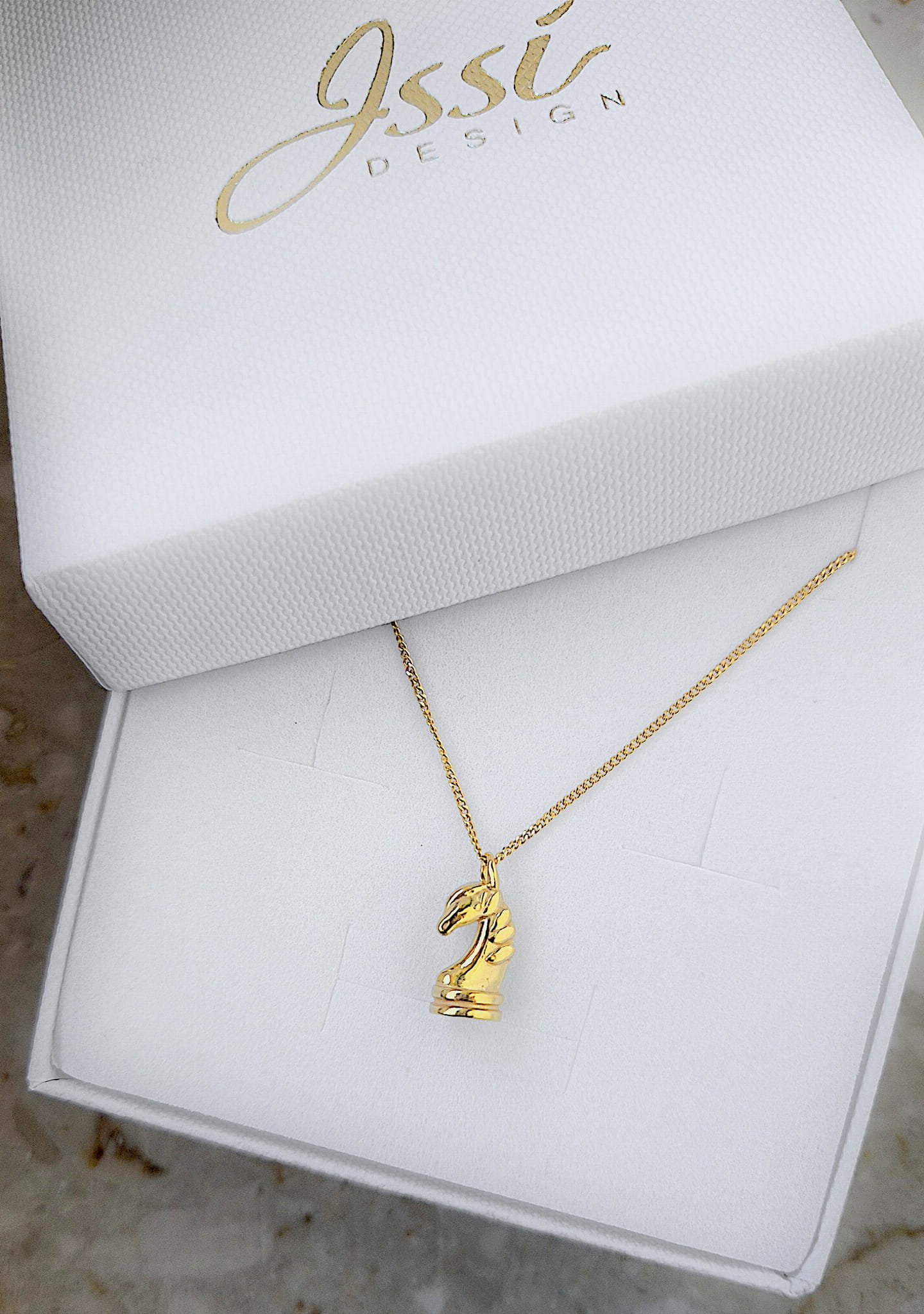 Naszyjnik z zawieszką w kształcie szachowego skoczka.