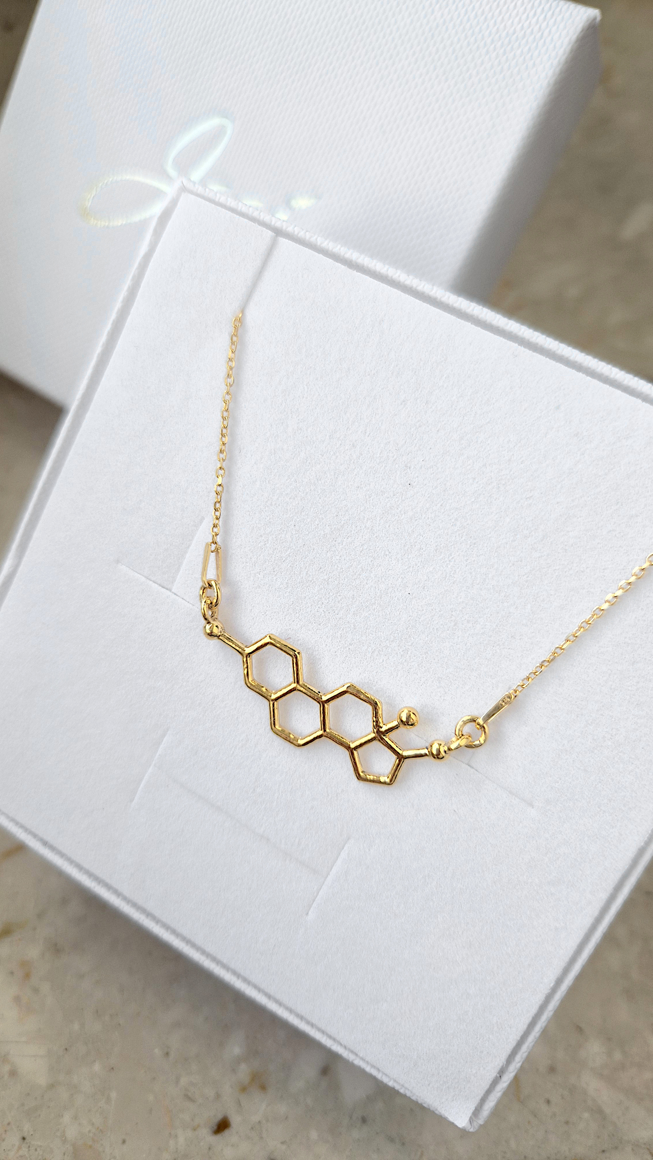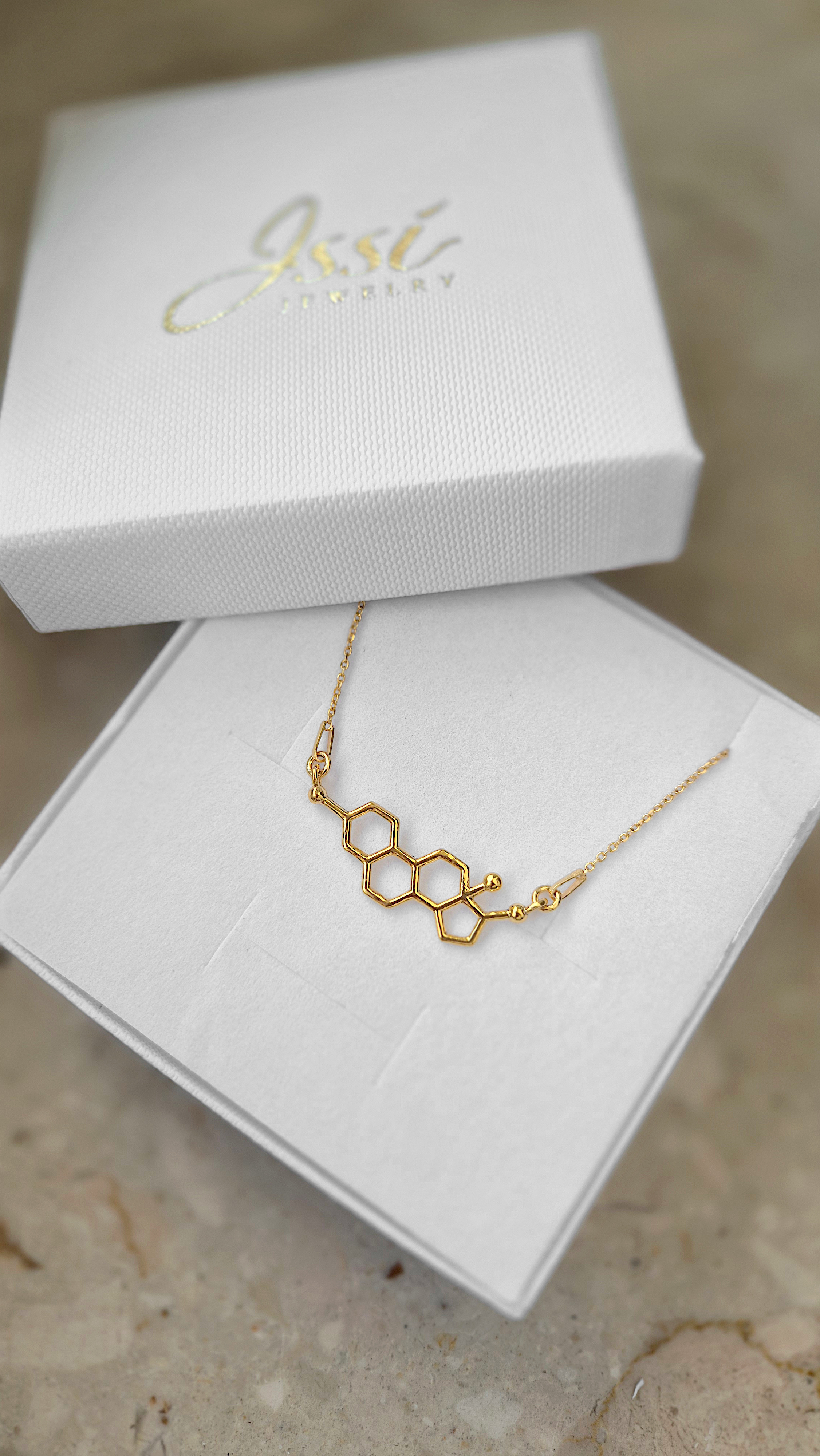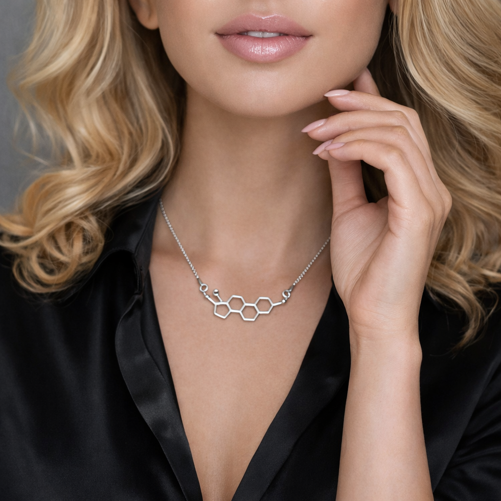 Naszyjnik wykonany ze srebra próby 925 , dostępny również w wersji ze srebra pokrytego 24-karatowym złotem lub 18-karatowym różowym złotem. Zawieszka w kształcie wzoru chemicznego Estrogenu.