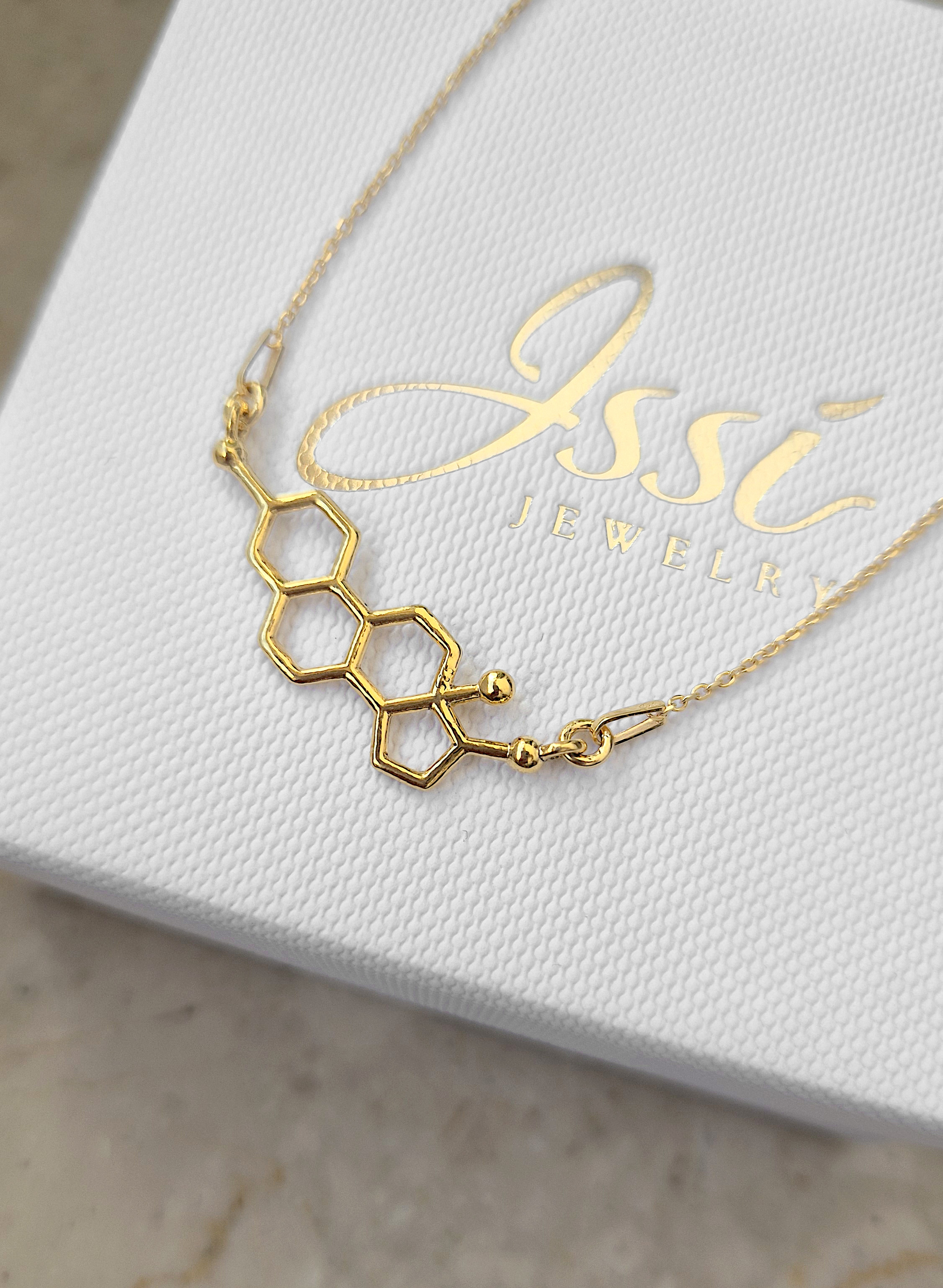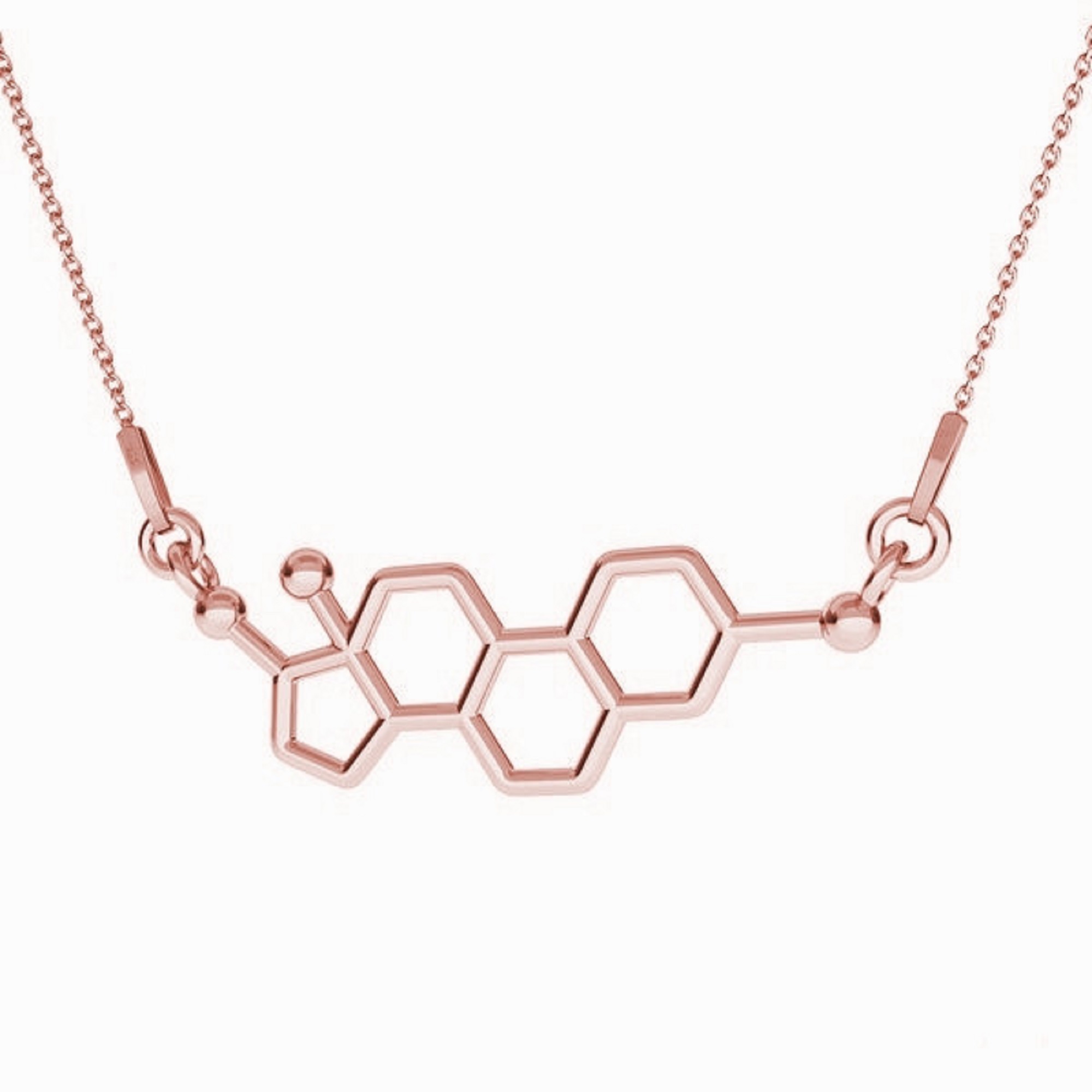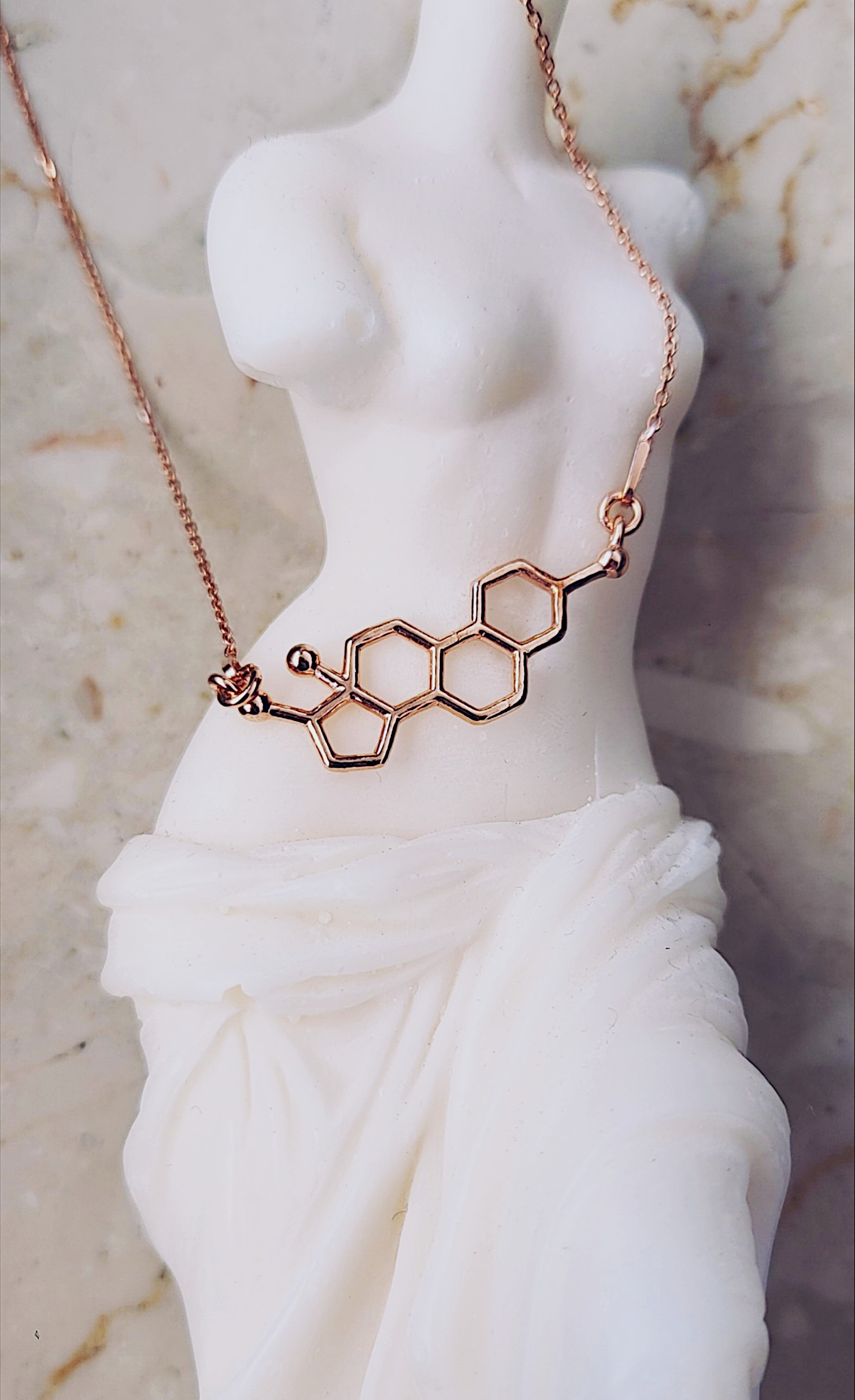 Naszyjnik wykonany ze srebra próby 925 , dostępny również w wersji ze srebra pokrytego 24-karatowym złotem lub 18-karatowym różowym złotem. Zawieszka w kształcie wzoru chemicznego Estrogenu.