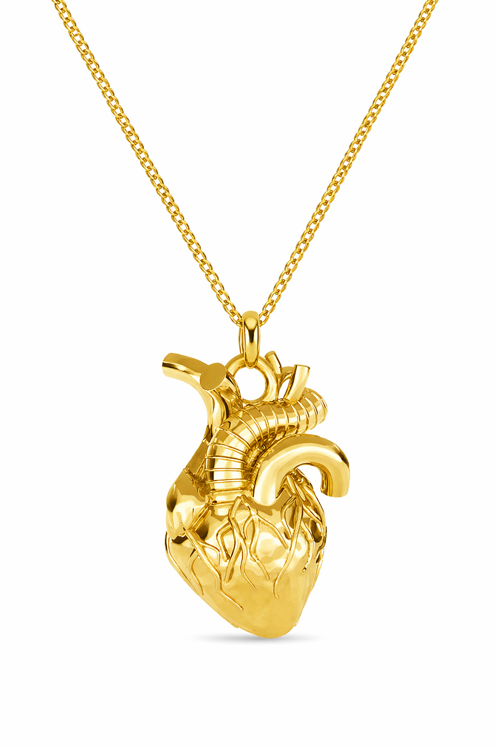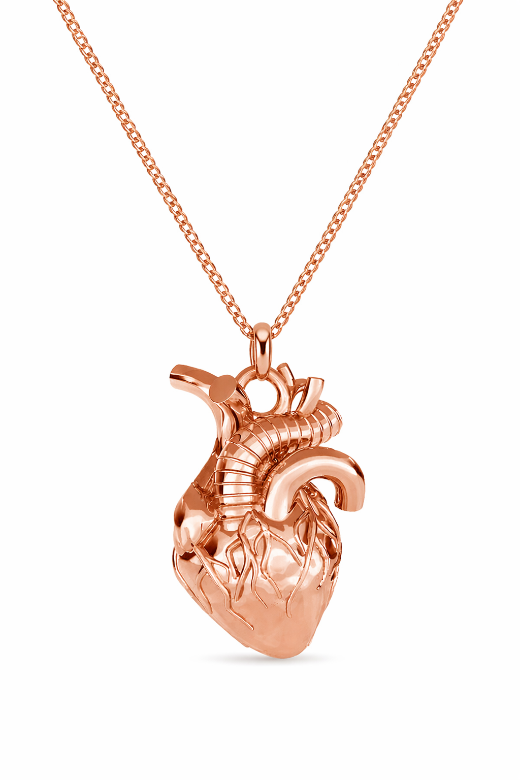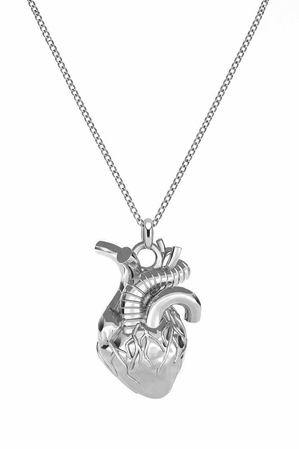 Trójwymiarowa forma zawieszki odwzorowuje realistyczny kształt serca – z widocznymi naczyniami i strukturą, co nadaje biżuterii unikalny, lekko surowy charakter.