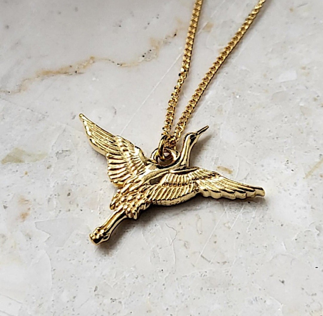 Naszyjnik z zawieszką w kształcie lecącego żurawia, wykonany ze srebra 925, srebra pokrytego dwoma warstwami 24 karatowego złota lub różowego złota.