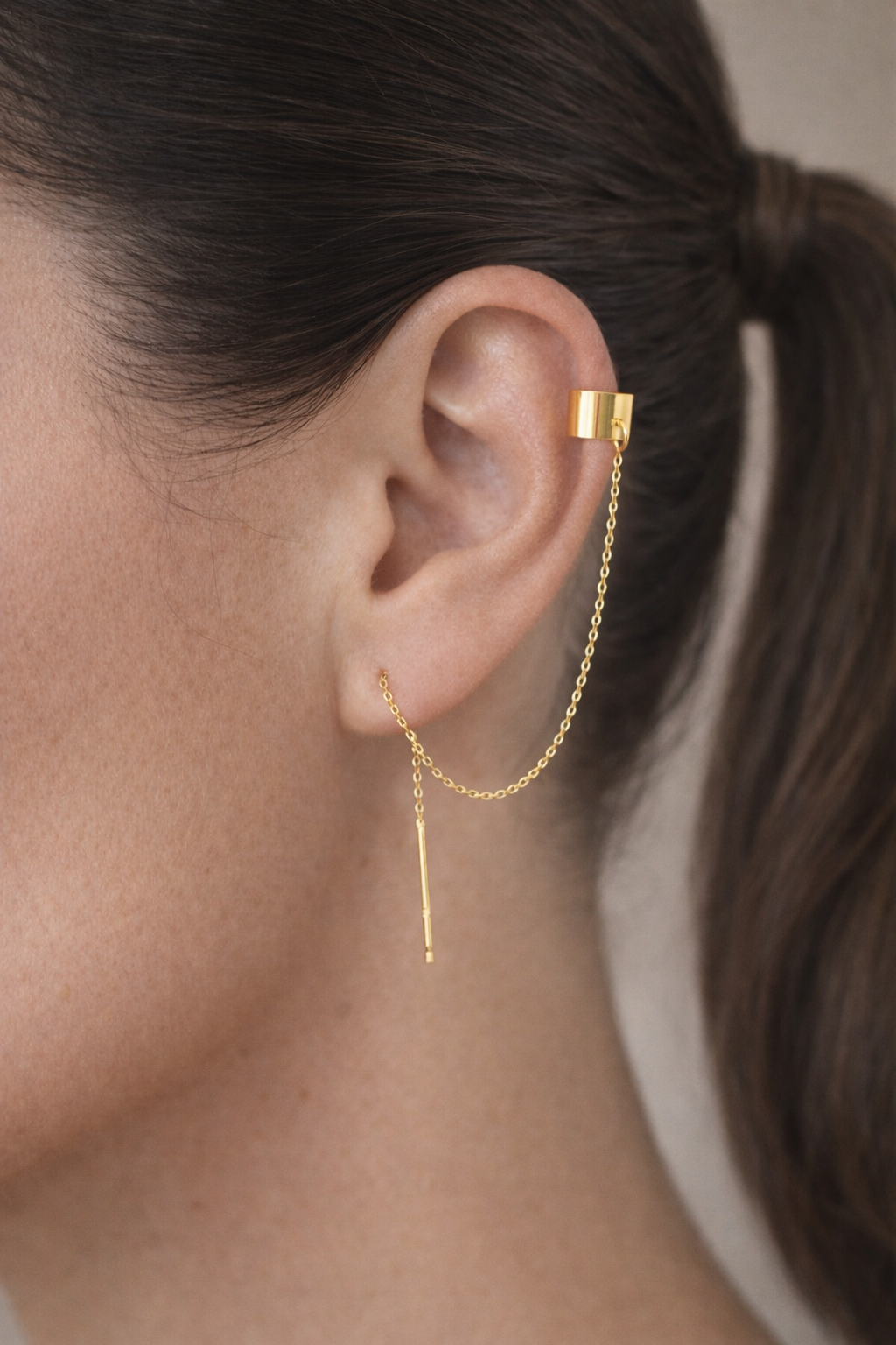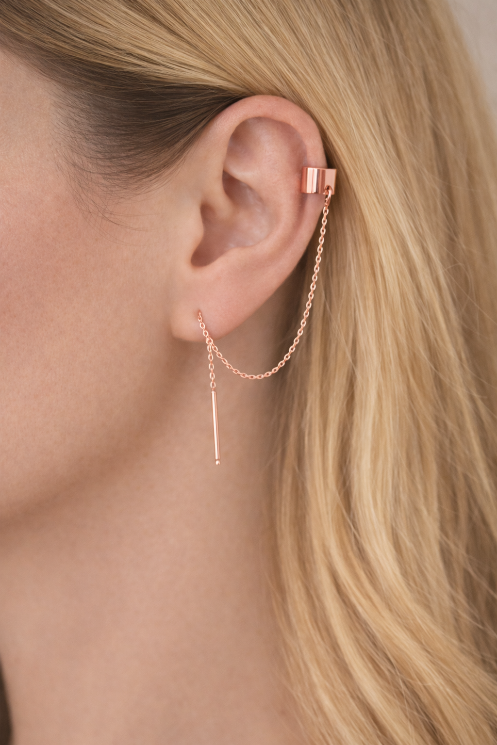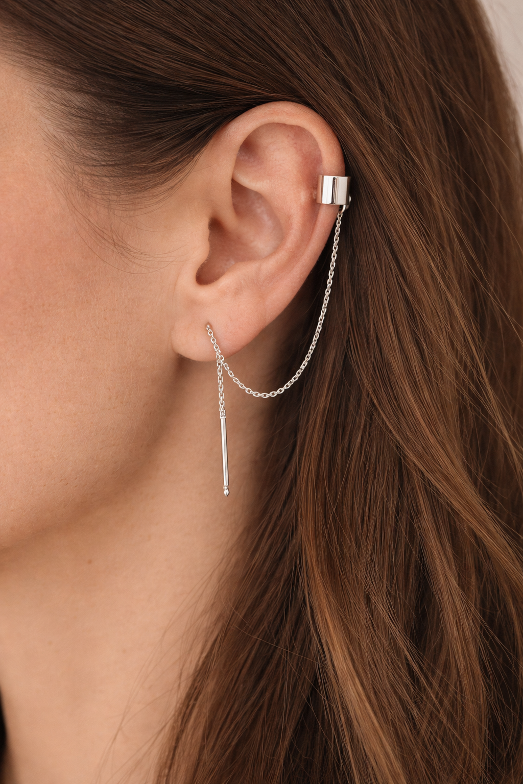 Ozdobna nausznica z łańcuszkowym kolczykiem, wykonana ze srebra próby 925, srebra pokrytego 24K złotem lub 14K różowym złotem.