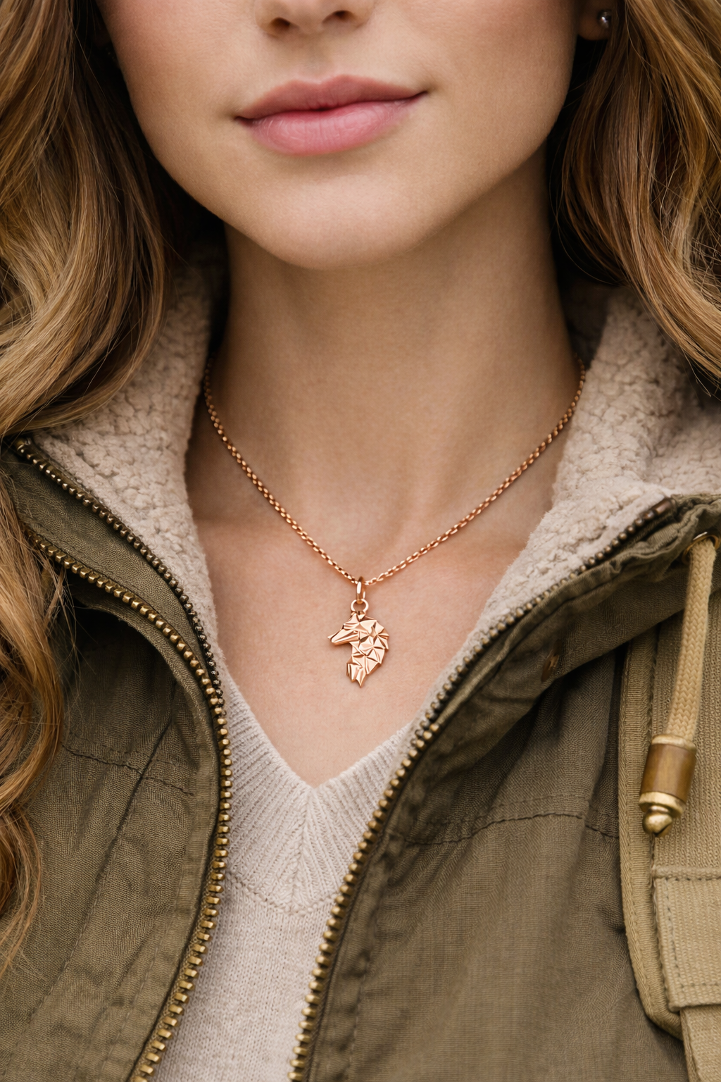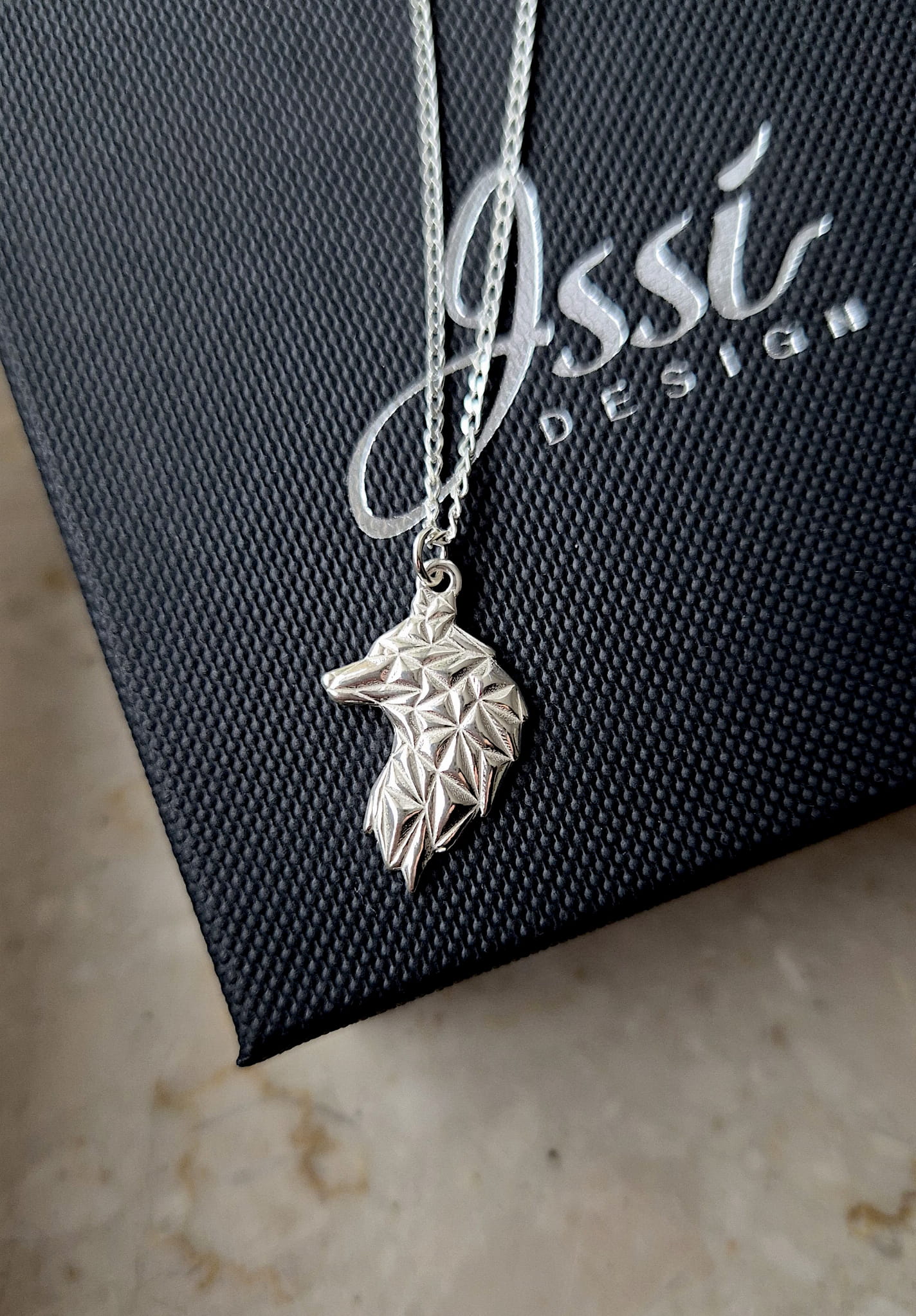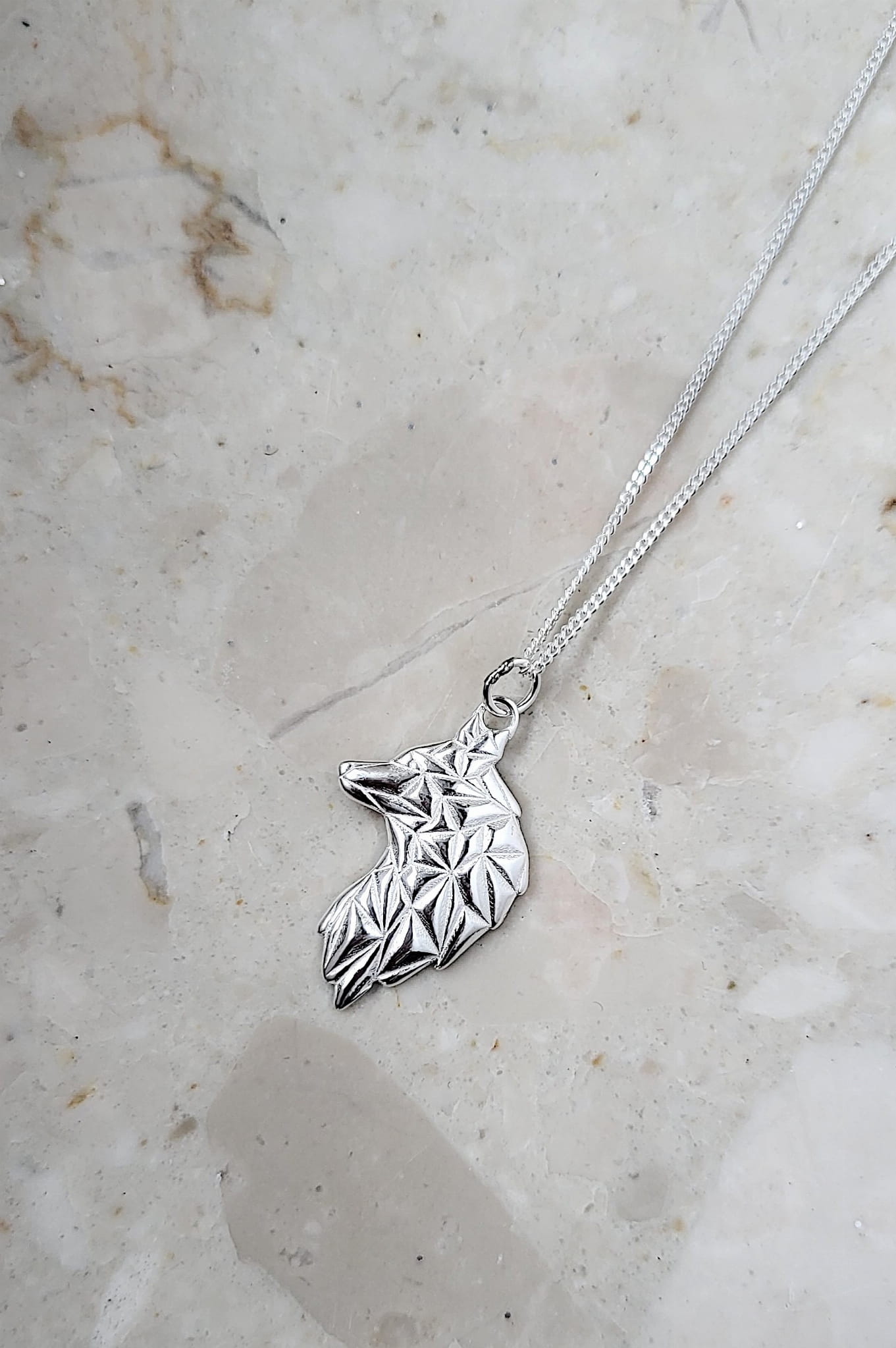 Naszyjnik wykonany został ze srebra próby 925. Dostępny jest w wersji klasycznej srebrnej, a także pokrytej 24-karatowym złotem oraz 18-karatowym różowym złotem. Zawieszka o wymiarach 23 × 15 mm zachowuje subtelne proporcje, pozostając jednocześnie wyraźnym elementem stylizacji. Gładka, starannie wypolerowana powierzchnia pięknie odbija światło, eksponując detale i załamania formy.